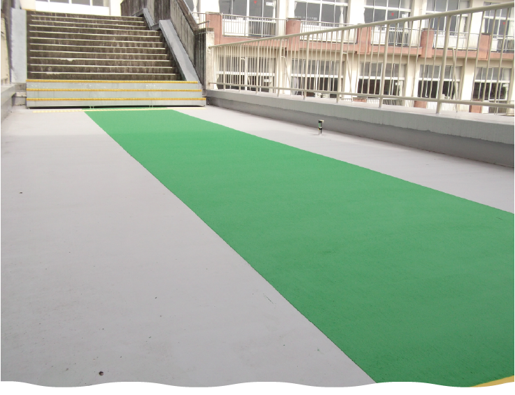 粘着シート対応では施工できなかった凸凹面やざらついた表面、広範囲への全面防滑施工が容易。