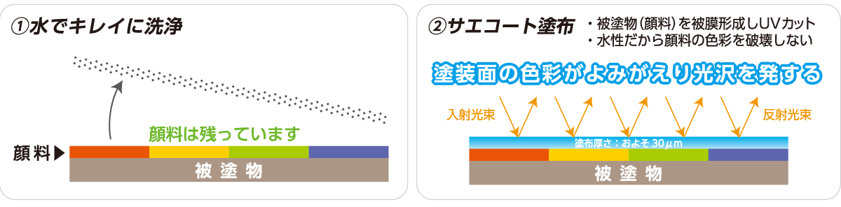 実際は塗装面に顔料が残っているため、サエコートで被塗物に被膜形成する事で色彩が蘇ります。